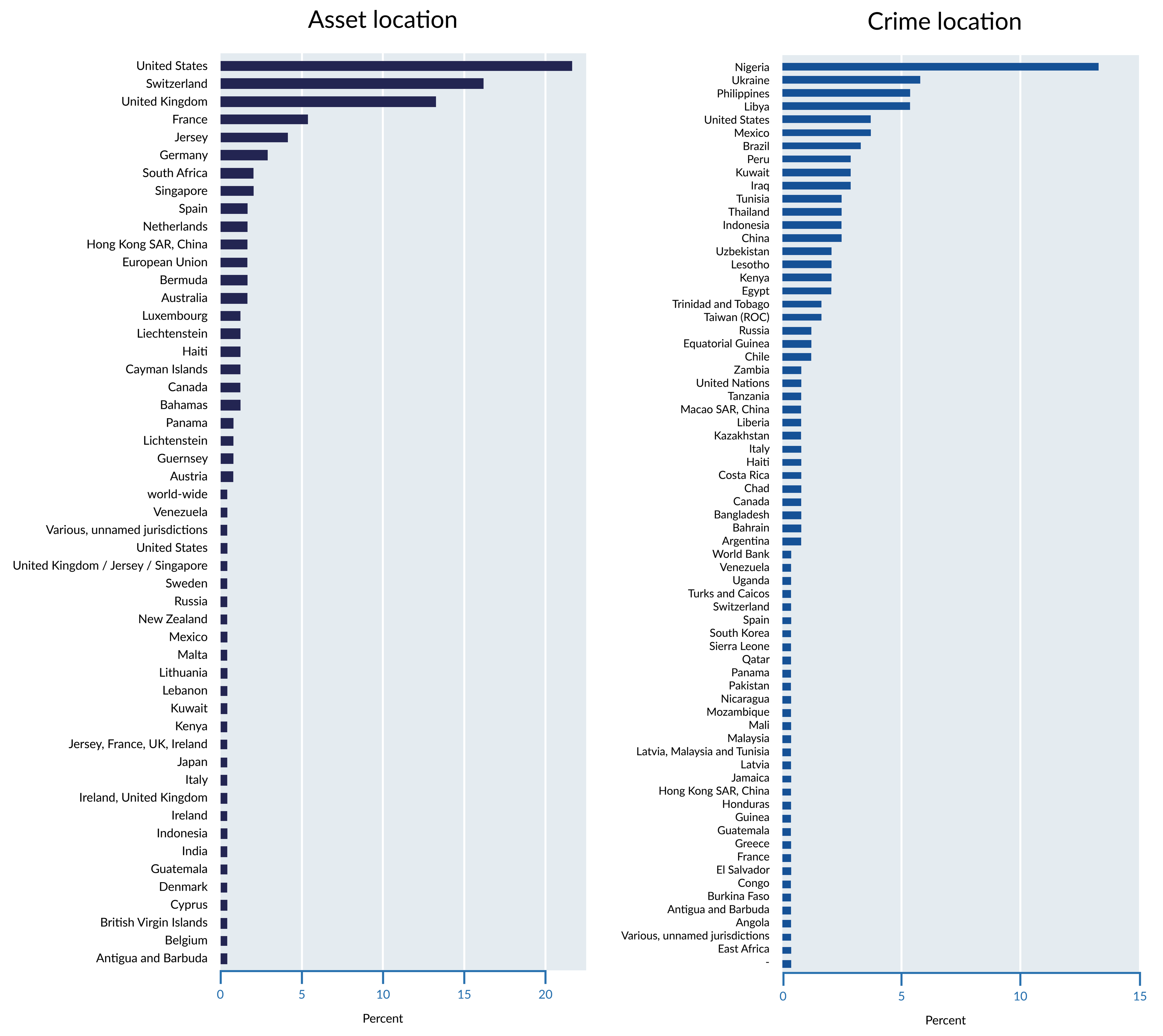 The potential impact of asset recovery becomes clearer when we consider that some countries are involved in many cases simultaneously. Figure 3 indicates how frequently states are named as locations of corrupt practices (‘crime location’) and as destinations in which illicit gains are invested or placed (‘asset location’). These numbers include duplicates in the StAR archive, so the number of unique cases for Nigeria, the Philippines, or Ukraine is lower. However, it seems clear that states from outside the OECD are the most frequent victims of large-scale corruption leading to asset recovery cases. Not counting some unresolved gaps, 65 different states show up as crime locations. Countries with high levels of corruption according to indicators such as the Corruption Perceptions Index5befd11d406b are featured prominently in this data.