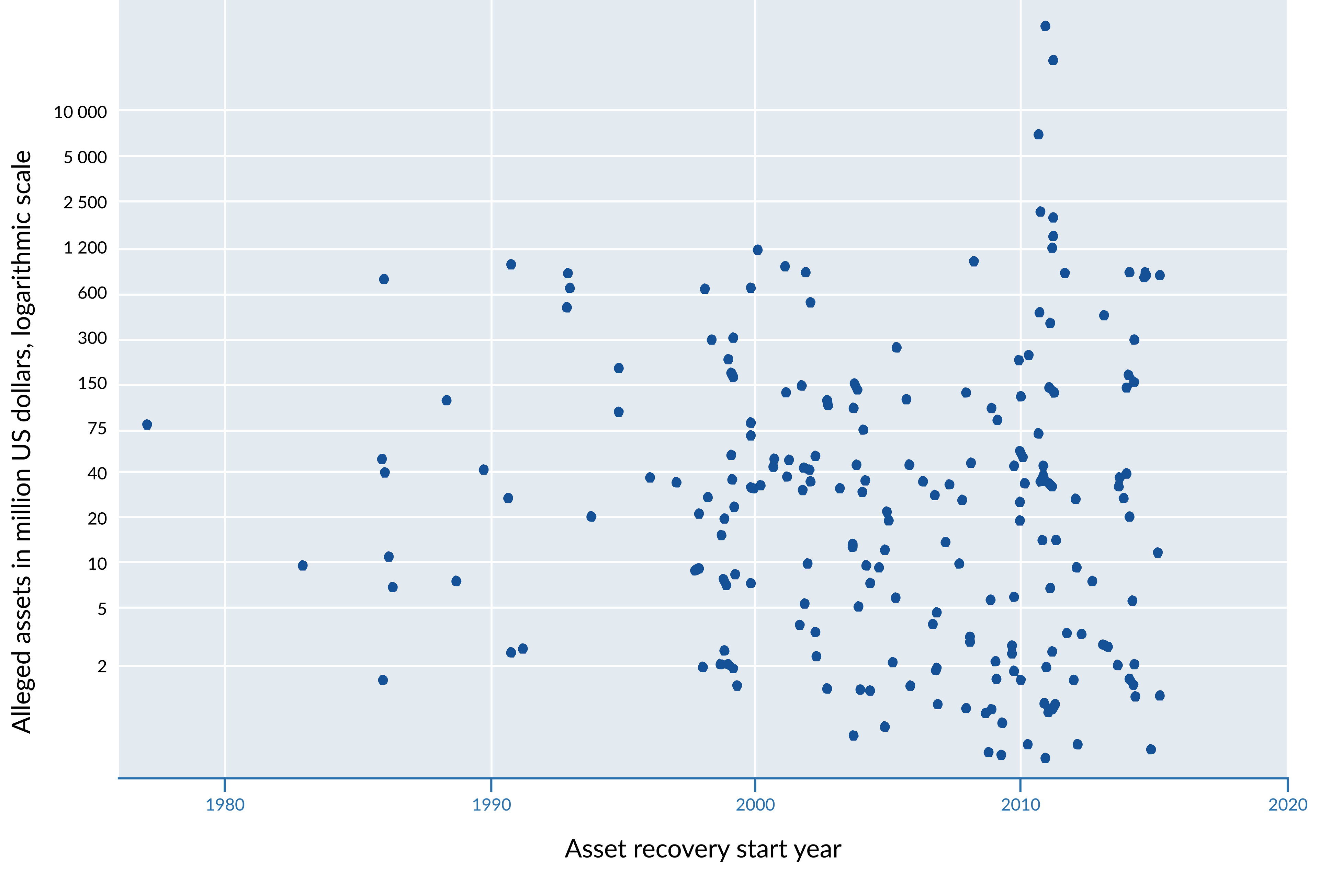 Figure 2 plots the amount of funds involved in each case of asset recovery, using the upper estimate when a range was given. To accommodate extreme values, the vertical axis is scaled logarithmically. Again, the proceedings related to the Arab Spring are outliers, reaching up to US$30 billion. Together, these figures show the massive scale of foreign assets under dispute: the mean value is US$450 million, with the median case still valued at US$22 million. Despite the moderate number of proceedings ongoing, asset recovery has the potential to make significant economic impacts, particularly for developing countries.