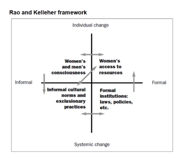 Moreover, at a project level, Rao and Kelleher’s framework to build a thorough and holistic approach to gender responsive programming can be used. For details, please see here.