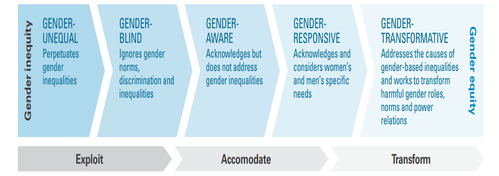 The Consortium of International Agricultural Research Centres (CGIAR) (n.d.) defines gender transformative approaches (GTAs) as “a method for tackling the roots of gender based inequalities, in particular constraining gender norms, and thereby kick-starting a process toward greater gender equality”. The idea is to engage both men and women to be agents of change together and not just burden women with the fight for equality (CGIAR n.d.). GTAs are a category on the chain (continuum) of gender integration approaches (FAO 2022; UNICEF n.d.). Please refer to the infographic below.