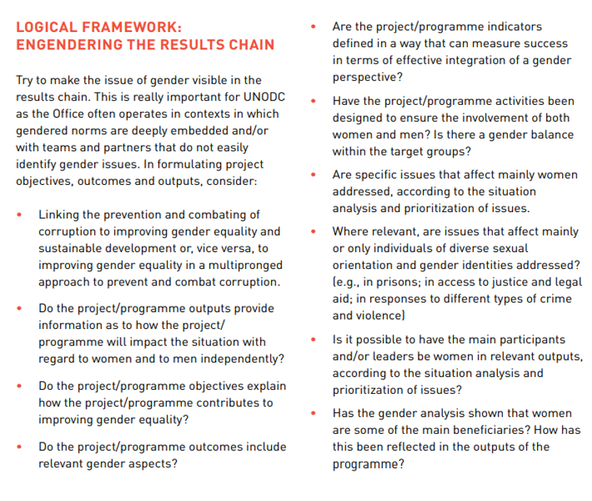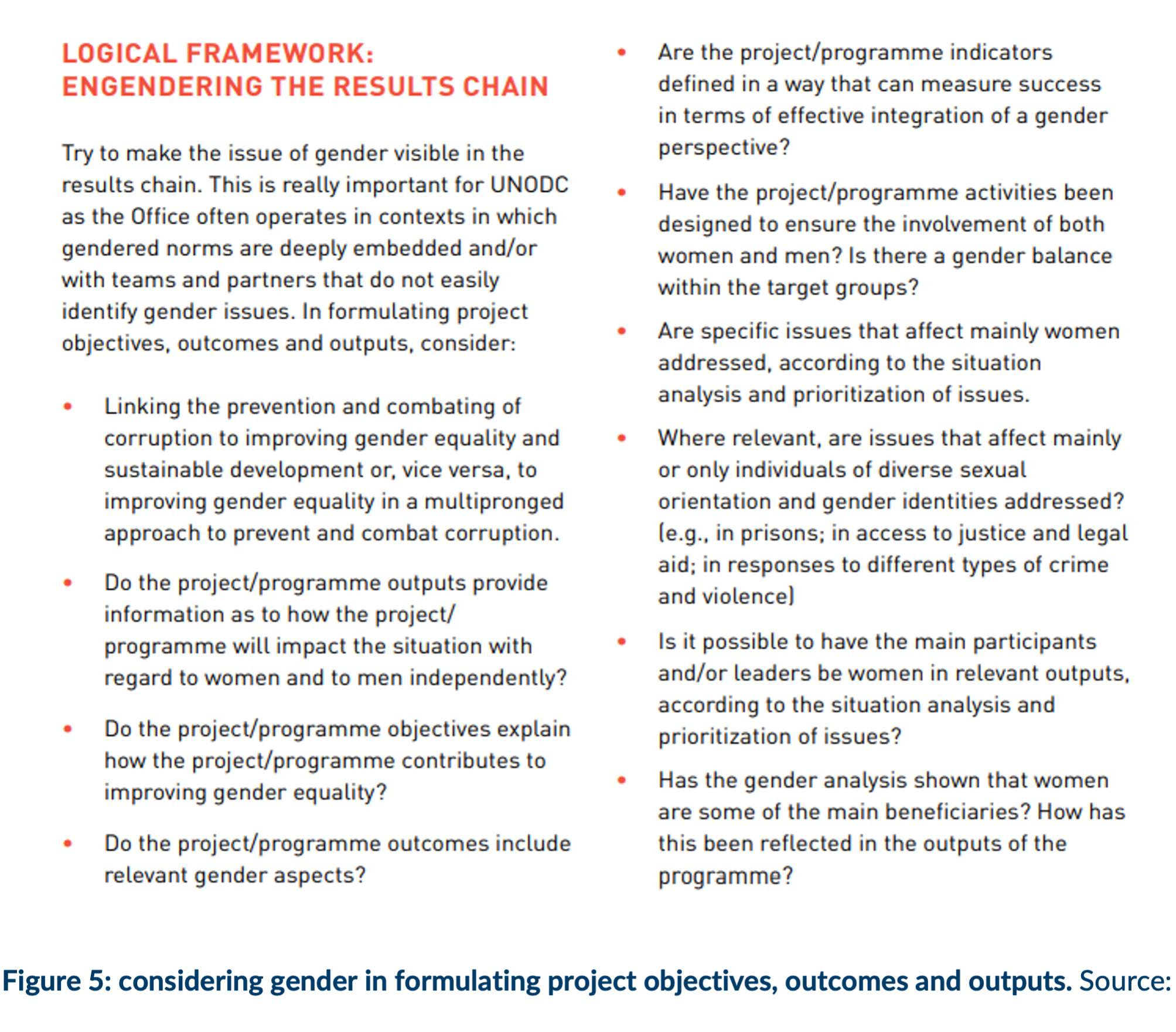 Apart from the illustrative ways of including a gender lens in corruption risk assessment mentioned in this section, the UNODC briefing note on Mainstreaming Gender in Corruption Projects/Programmes serves as a helpful guide. It recommends making “anti-corruption efforts gender responsive by using social audits on women’s access to services, enacting legislation recognizing gendered impacts of corruption, addressing sexual extortion as a form of corruption, implementing regulations to address sexual extortion, and having gender sensitive complaint mechanisms” (UNODC 2021 a). Please see the infographic below for some questions to consider in embedding gender in anti-corruption measures (which could be applied to