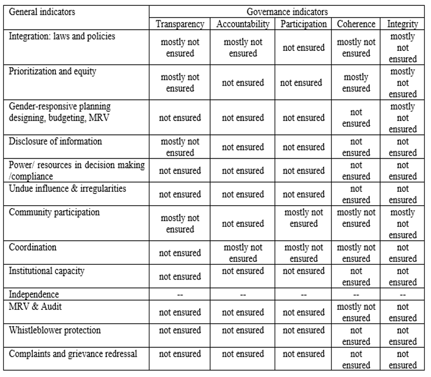 The study uses 13 pre-identified indicators to analyse gender sensitivity in climate finance. These indicators are then weighed against the governance indicators of transparency, accountability, participation, coherence and integrity. Finally, a matrix is tabulated to present a snapshot of gender responsive governance in climate finance in the country (Transparency International forthcoming). Please see the table below: