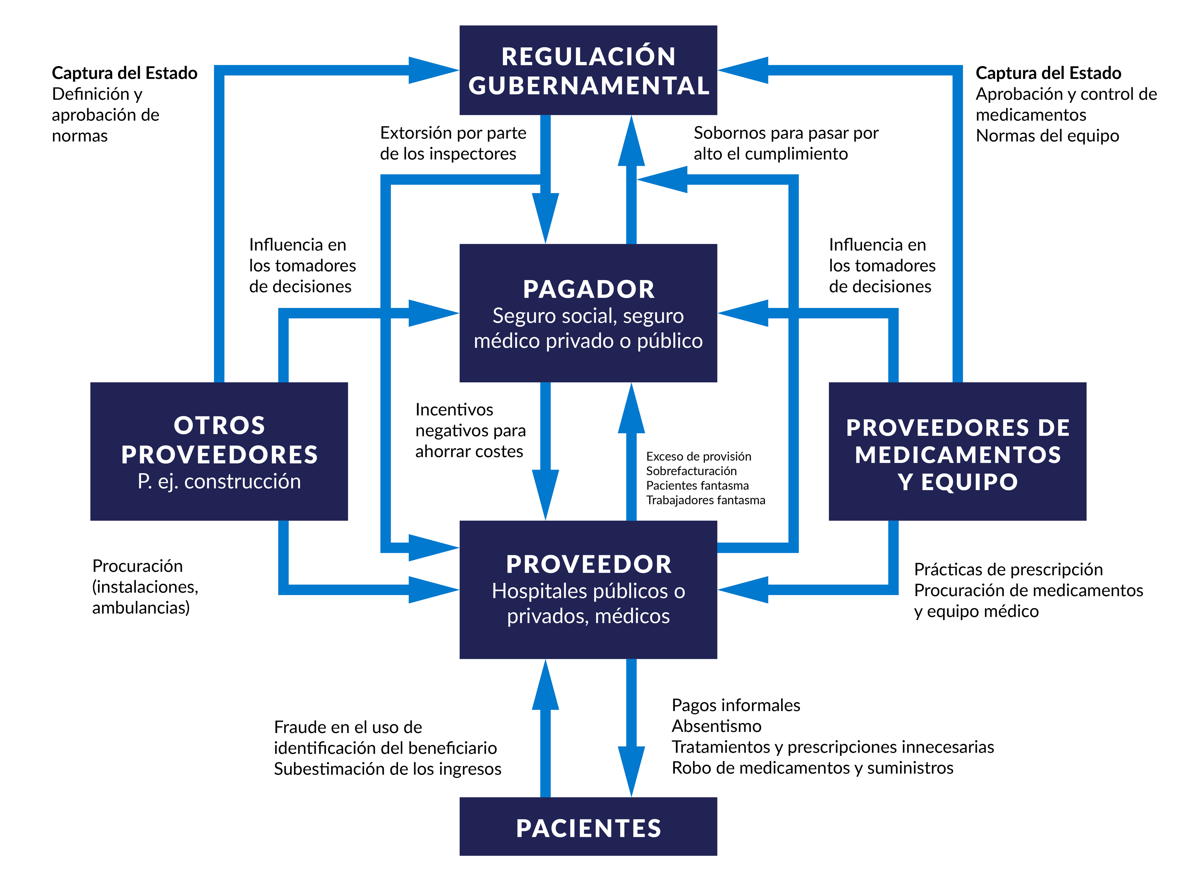 La Figura 1 ilustra los riesgos de corrupción típicos que surgen de las relaciones entre estos actores principales. La mayoría de las investigaciones públicas disponibles sobre estos riesgos y las posibles estrategias de mitigación se centran en el nivel de prestación de servicios, es decir, en las interacciones entre proveedores y usuarios, así como en la cadena de suministro de productos farmacéuticos y sanitarios. Los riesgos de captura institucional, regulatoria y de políticas, y de interacciones corruptas entre pagadores y proveedores, tienden a ser poco investigados, aunque tienen un gran impacto en el desempeño general del sistema de salud.