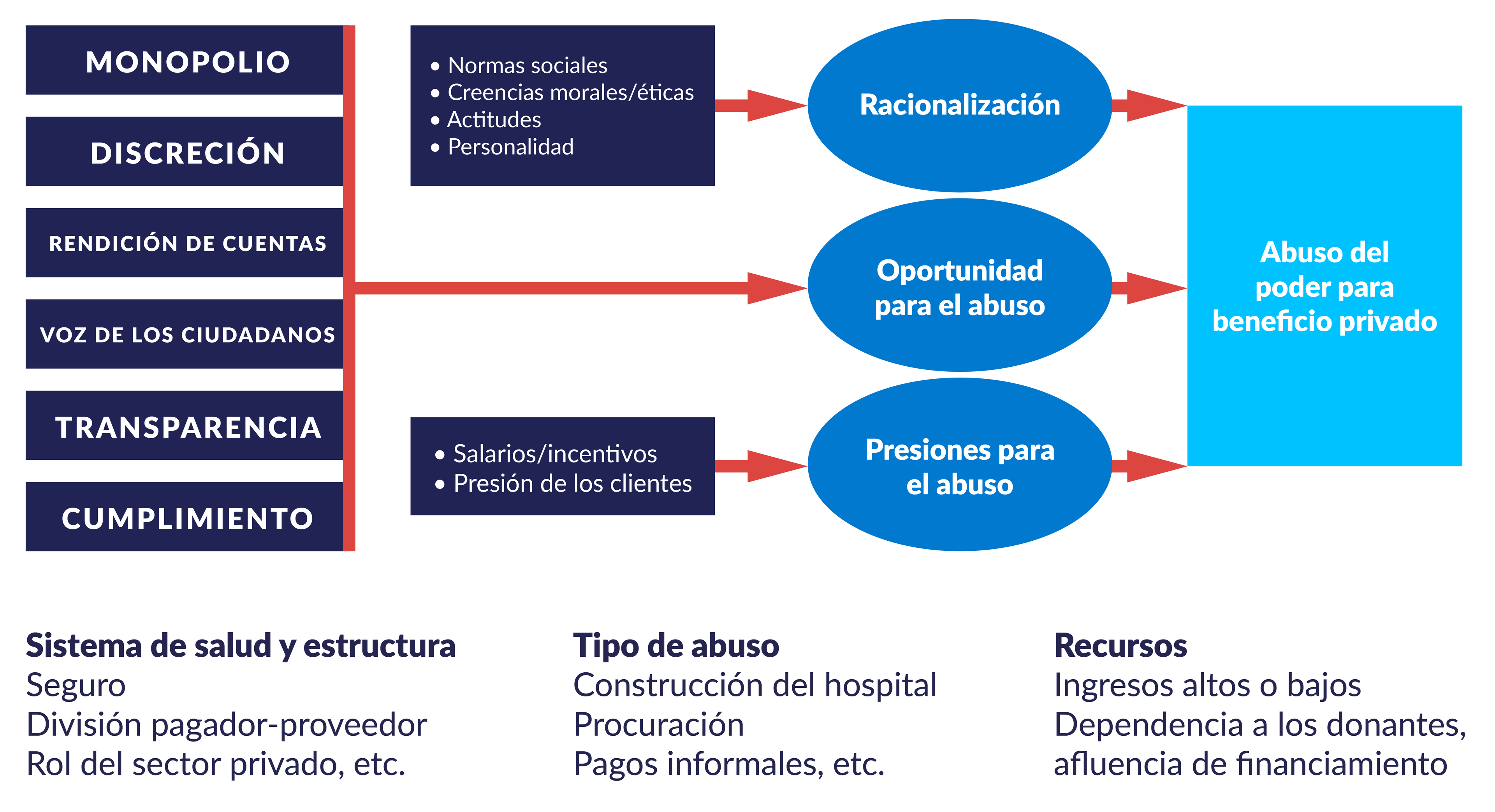 Varios factores hacen que los sistemas de salud sean particularmente susceptibles a la corrupción. Entre estos, se incluyen las grandes cantidades de recursos que fluyen a través de estos sistemas, el alto nivel de incertidumbre; asimetría de la información, la gran cantidad de actores, la complejidad y fragmentación de los sistemas nacionales de salud y la naturaleza globalizada de la cadena de suministro de medicamentos y dispositivos médicos. Estos factores, que se explican brevemente a continuación, dificultan la transparencia y la rendición de cuentas y crean oportunidades sistemáticas de corrupción, captura del regulador y presión indebida del mercado.