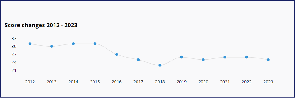 In general, available survey data suggests there is a medium-to-high prevalence of corruption in Mozambique. Its 2023 corruption perceptions index (CPI) score was 25/100, ranking it 145 out of 180 countries measured; this score has remained largely stagnant in recent years (see Figure 4). Furthermore, the 2019 Global Corruption Barometer found 35%t of public service users had paid a bribe in the previous 12 months to being surveyed (Transparency International 2019).