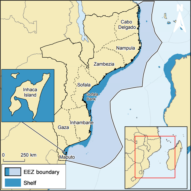 Mozambique in southeast Africa has a coastline facing the Indian Ocean (also known as the Mozambique channel region) stretching over 2,700 kilometres. Its territorial waters and exclusive economic zone – the area of the sea in which it has exclusive rights under international law regarding the use of marine resources such as fish species (as depicted in Figure 1) – constitutes around 587,000 km2 and a rich marine life (FAO 2023).