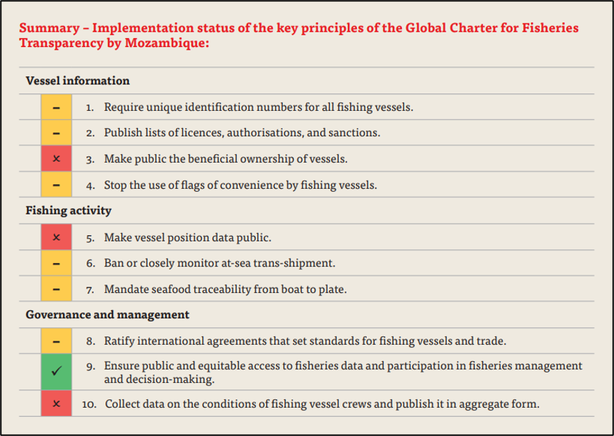For principle 10, oncollecting data on the conditions of fishing vessel crews and publishing it in aggregate form, EJF assessed that this was not required under Mozambican law and nor was it publicly available (Environmental Justice Foundation 2024a: 21).