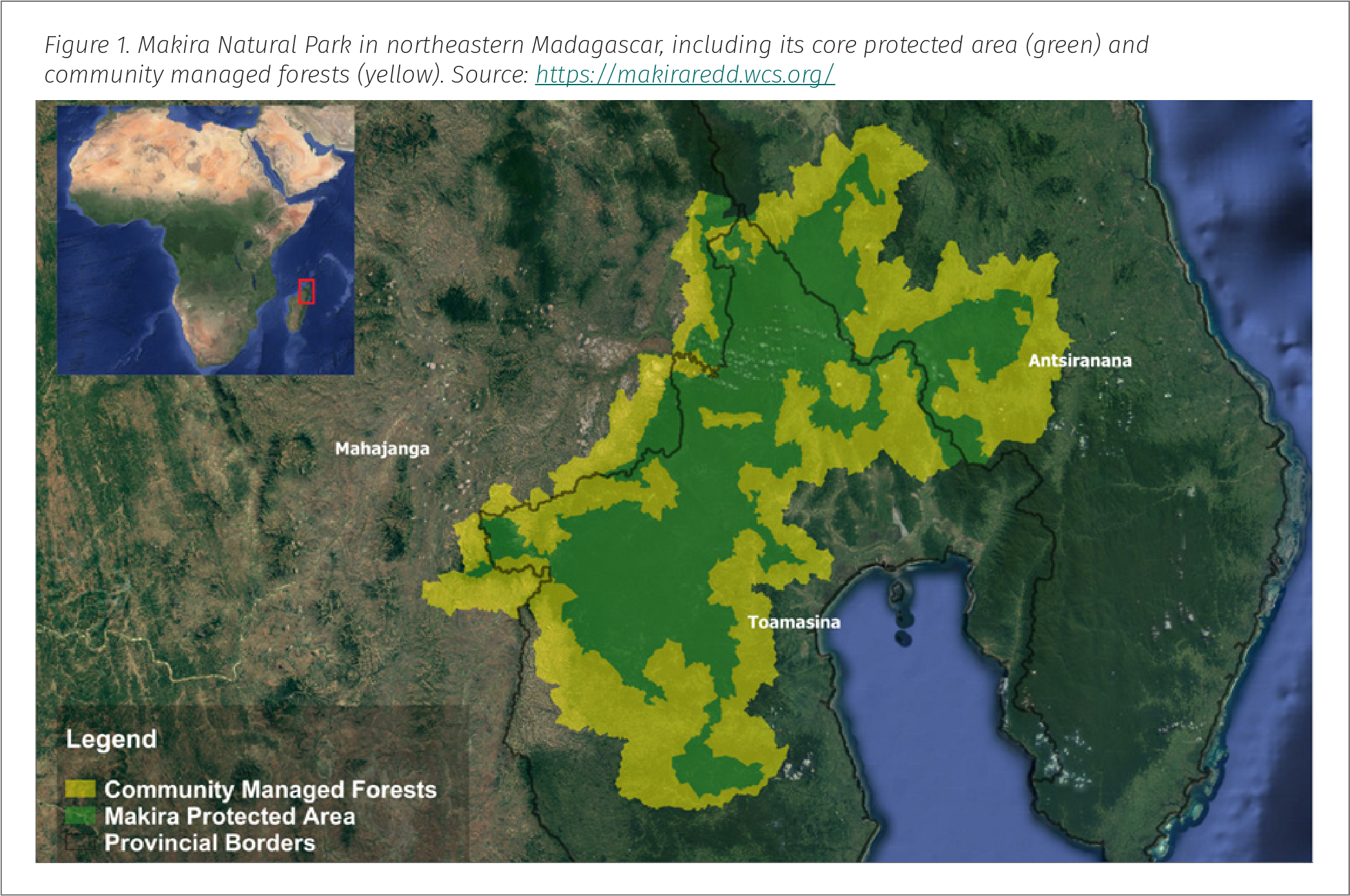 Figure 1. Makira Natural Park in northeastern Madagascar, including its core protected area (green) and community managed forests (yellow). Source: https://makiraredd.wcs.org/