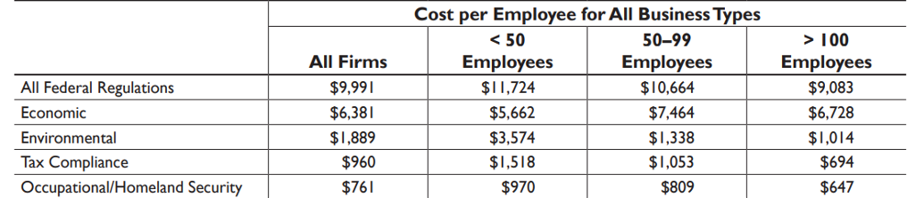 Another study by the Competitive Enterprise Institute found that large firms in the United States report that the average cost of maintaining compliance runs at US$9,991 per employee (Crews Jr 2018:17). These figures vary according to the size of the firm, as seen in the infographic below:
