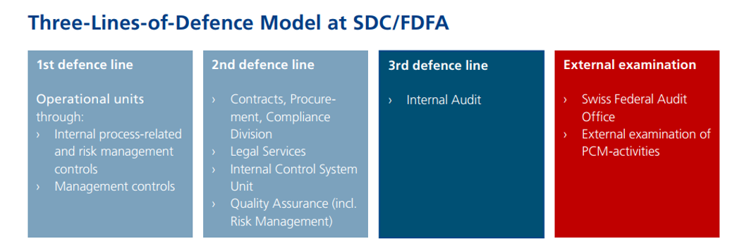 In the case of Switzerland, the Federal Department of Foreign Affairs (FDFA) and the Swiss Agency for Development and Cooperation (SDC) have developed a “three lines of defence model” (see infographic below):