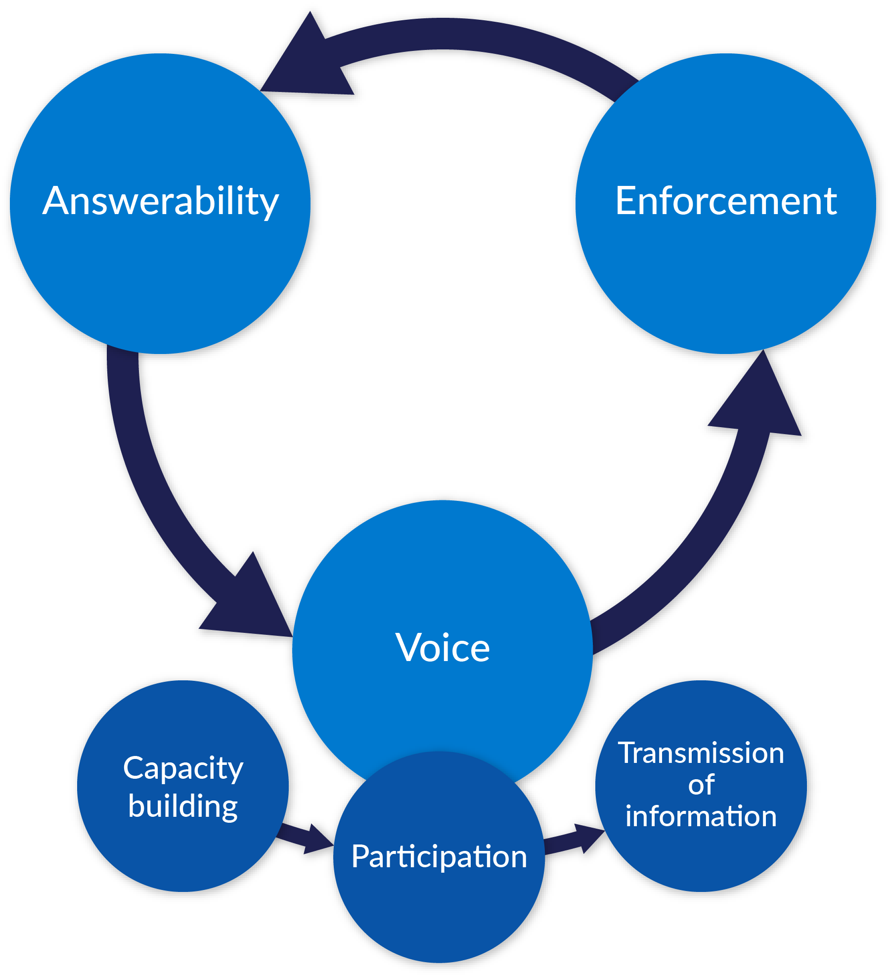 At its core, social accountability involves generating and articulating citizens’ voice to elicit enforcement of sanctions when public service provision fails, and to promote answerability of public authorities. Therefore, effective social accountability is made up of three building blocks – voice, enforceability and answerability – which together form a cycle.