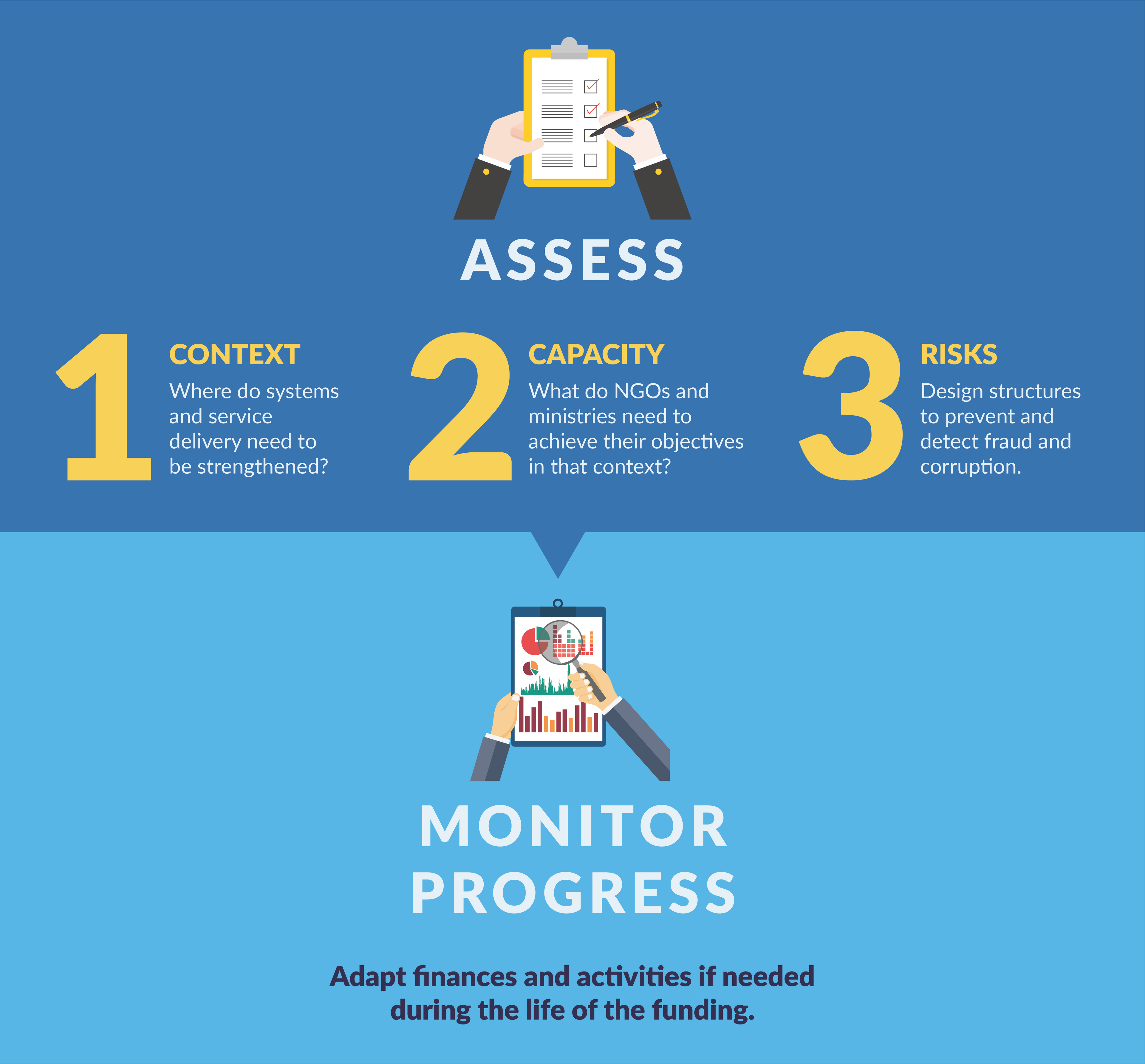 Development actors should consider interim assessments, especially with new programmes or new implementers, to catch issues early. This ‘rolling audit’ type of approach ensures that implementers continuously improve their systems to identify and manage risks, subsequently ensuring the success of development programmes.