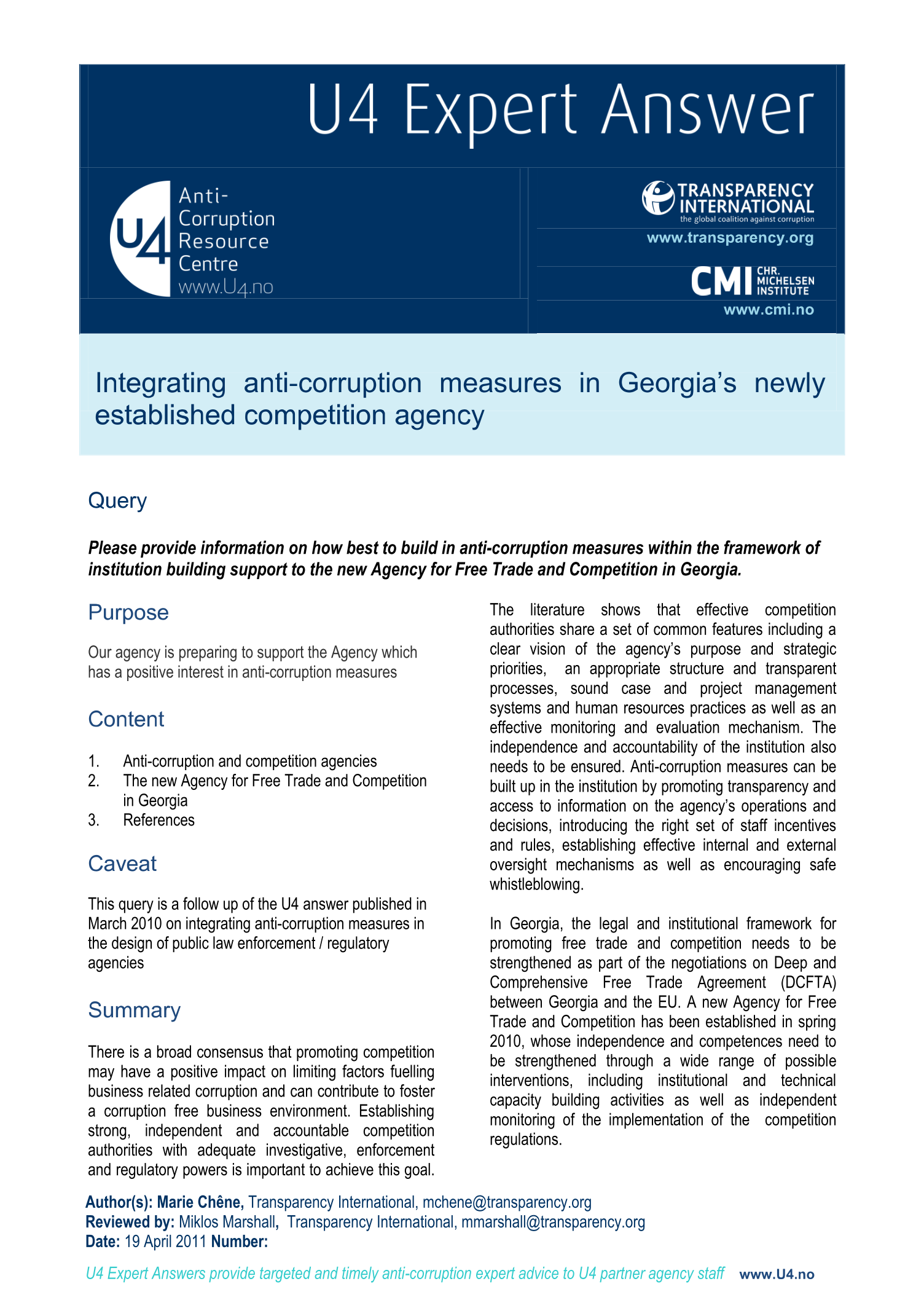 Chêne, M. 2011. Integrating anti-corruption measures in Georgia’s newly established competition agency. Bergen: U4 Anti-Corruption Resource Centre, Chr. Michelsen Institute (U4 Helpdesk Answer null)