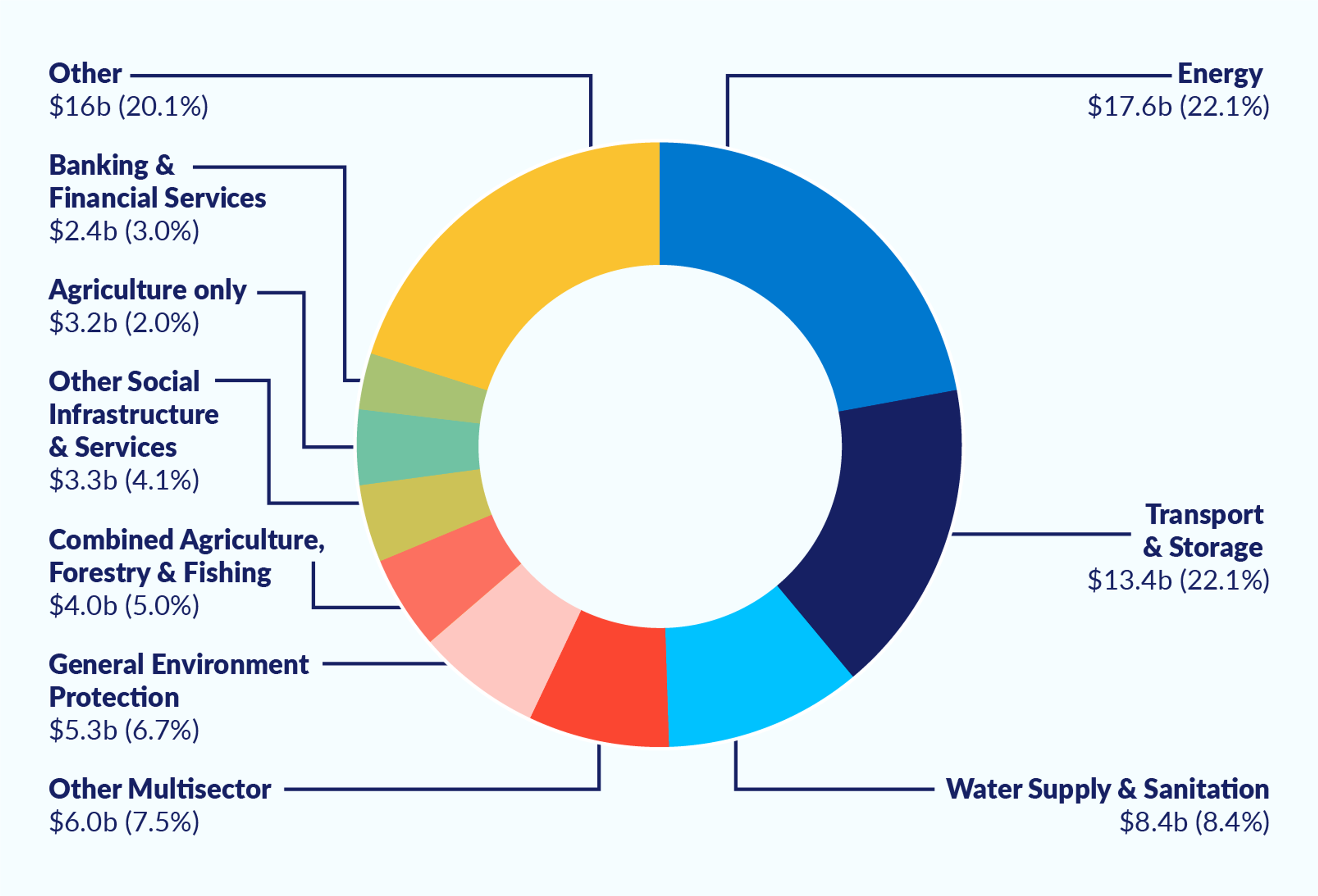 The OECD categorises CRDF into 41 sectors. Figure 1 shows the top ten sectors in terms of their percentage share of total CRDF, with the dollar value shown in the pie chart.