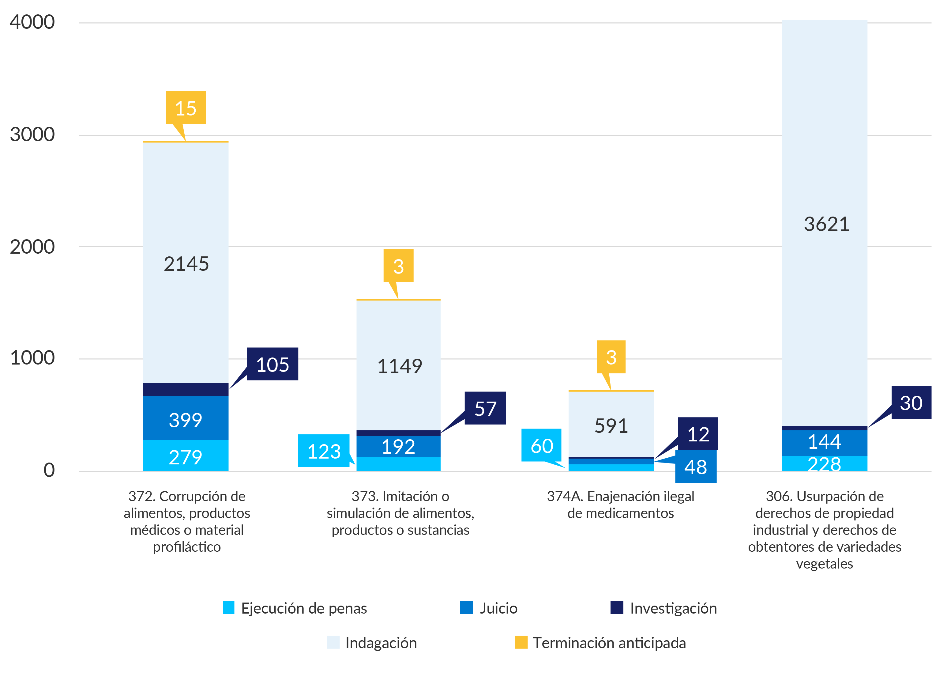 Aunque la Fuerza Pública tiene la capacidad de investigar y ejecutar acciones de decomisos y aprehensiones a personas que al falsificar medicamentos han incurrido en un delito, es la Fiscalía General de la Nación la entidad responsable de gestionar cada caso, de investigar el accionar de estas personas y de acusarlas ante las autoridades judiciales. Para esta tarea la Fiscalía se vale de los delitos que se encuentran en el Código Penal colombiano Ley 599 de 2000 que determinan una acción y establecen una pena correspondiente.