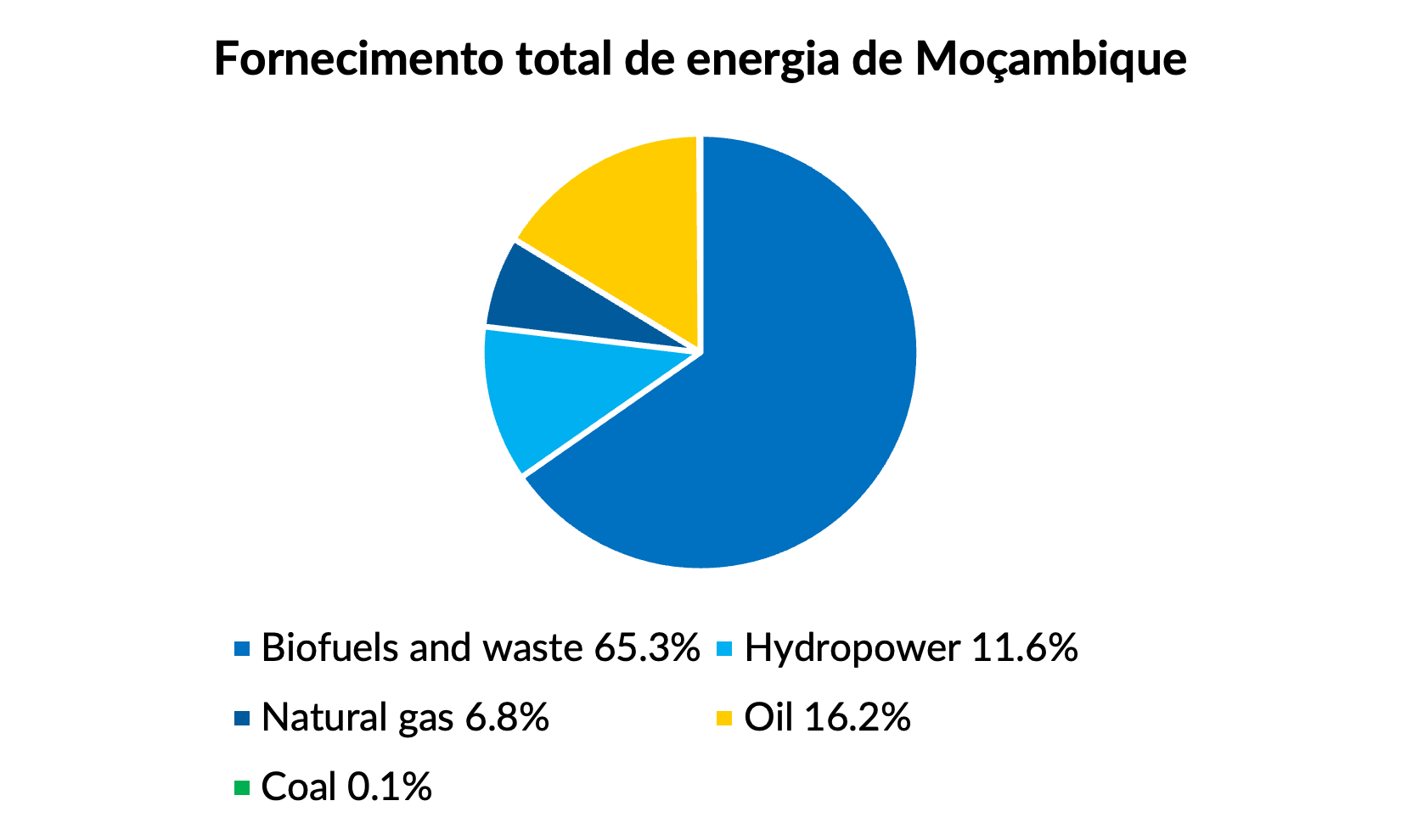 A produção elétrica doméstica de Moçambique depende largamente da energia hidroelétrica, que representa cerca de 77% de toda a energia produzida (Cotton, Kirshner e Salite 2019). Não obstante, tal como indicado na Figura 1, apesar de Moçambique ser um exportador líquido de energia, a maior parte da população de Moçambique continua altamente dependente de biocombustíveis e resíduos, o que geralmente consiste na queima de lenha e carvão (União Africana s.d.). O setor da lenha para combustível no país é informal, mas é eficiente em matéria de custos para famílias com baixos rendimentos (Salva Terra 2022).
