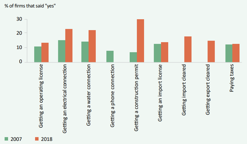 Figura 2: Respostas ao inquérito do Banco Mundial (um em 2007 e outro em 2018) a perguntar às empresas se lhes foi pedido um suborno em Moçambique