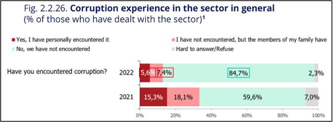 The NACP (2023) carried out a survey asking respondents if they had encountered corruption in primary and secondary educational institutions over the last 12 months. In 2022, 5.6% of respondents said they had encountered corruption, while 7.4% said they had not personally but members of their families had; however, these represented significant decreases compared to 2021 where the same response levels were 15.1% and 18.1% respectively (see Figure 3).