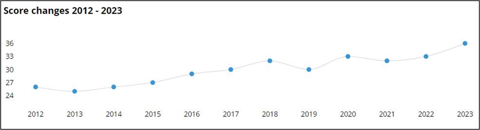 Corruption is generally perceived by the public to be a serious issue in Ukraine. In a 2023 survey, respondents ranked it the third most important challenge facing the country after Russian armed aggression and increase in the cost-of-living (NACP 2023). Ukraine received a score of 36/100 in the 2023 Corruption Perceptions Index, thus placing it 104 out of 180 countries (Transparency International 2024); however, this score has been gradually improving since 2012 (see Figure 2). Several international actors, for example, the International Anti-Corruption Advisory Board (IACAB) associated with the European Union Anti-Corruption Initiative (EUACI), have recognised that Ukraine has made significant progress to counter corruption (EUACI 2023).