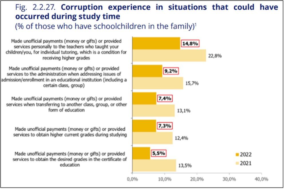 Respondents to a 2023 survey of persons working in the wider education sector overwhelmingly agreed with the sentiment that corruption needed to be addressed in the sector, but that this would be difficult in light of the Russian full-scale invasion and socio-economic conditions (Hasiuk et al. 2023).