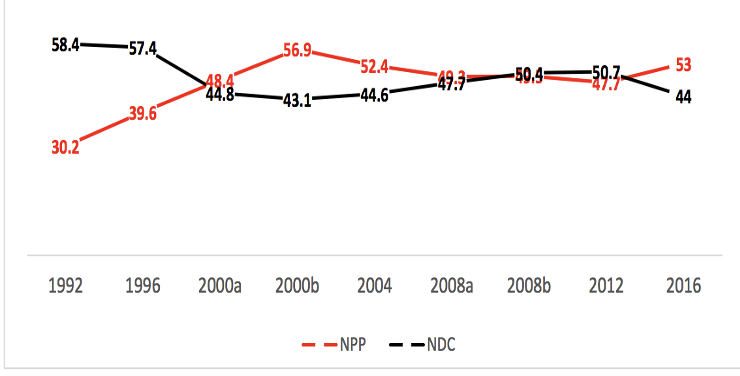 Figure 1. Percentage of NPP and NDC votes in presidential elections, 1992–2016