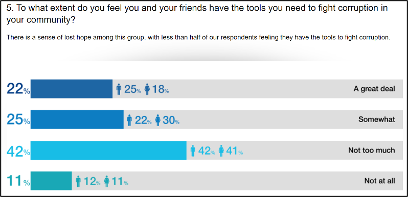 These views are supported by some survey evidence. Responses to the UN ‘s 2014 MY World survey suggest that young people largely do not feel they are adequately equipped to fight corruption in their local community (see Figure 5).
