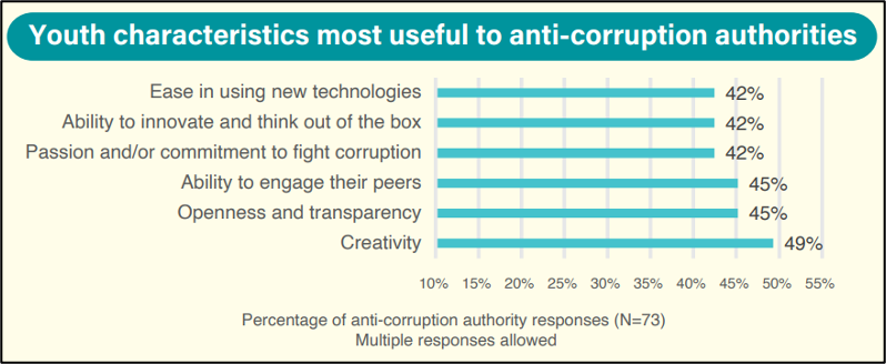 Pring (2015) explains that one of the main benefits of engaging young people is that they “are more likely to be creative in their approach to problem-solving, meaning anti-corruption efforts may be more innovative, forward-thinking, and make better use of modern technology”. In this sense, younger people can bring insights and novel techniques with which older generations involved in anti-corruption efforts may be less familiar. Responses to a UNODC (2023) survey of 73 anti-corruption authorities around the world indicate widespread endorsement of young people’s potentially innovative contribution, including in using new technologies (see Figure 3).