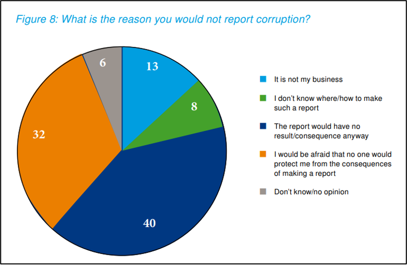 Nevertheless, some young people may be reluctant to report corruption. There were mixed responses to a questionnaire distributed to young people by the Independent Commission Against Corruption of Mauritius (2019) on their willingness to report corruption. Many respondents who indicated a willingness to report corruption they would encounter based their answer on a sense of justice or duty. However, young people who stated their unwillingness to report corruption cited reasons such as fear of reprisals and a general lack of interest. In a 2016 survey by Transparency International Hungary of young people aged 18 to 29, respondents who said they would be unwilling to report corruption shared their reasons (see Figure 4).