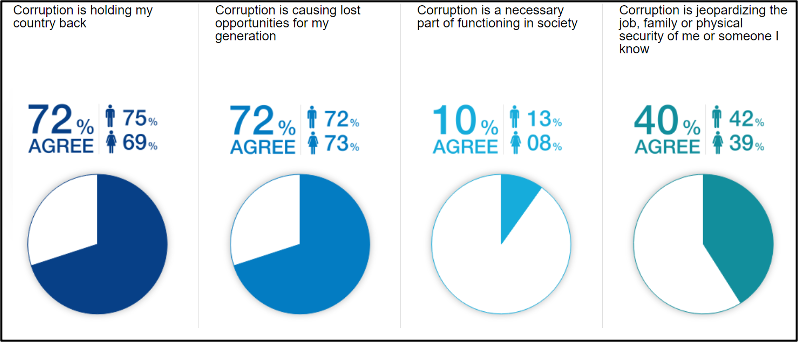 The survey is one of the few examples of a youth-centred cross-national surveys that allows for comparison between regions. For example, in terms of agreement with the statement “corruption is holding my country back”, while the average level was 72%, this rose to 90% for respondents from sub-Saharan Africa. Notably fewer (61.6%) of respondents living in what were classified as advanced economies expressed this view.