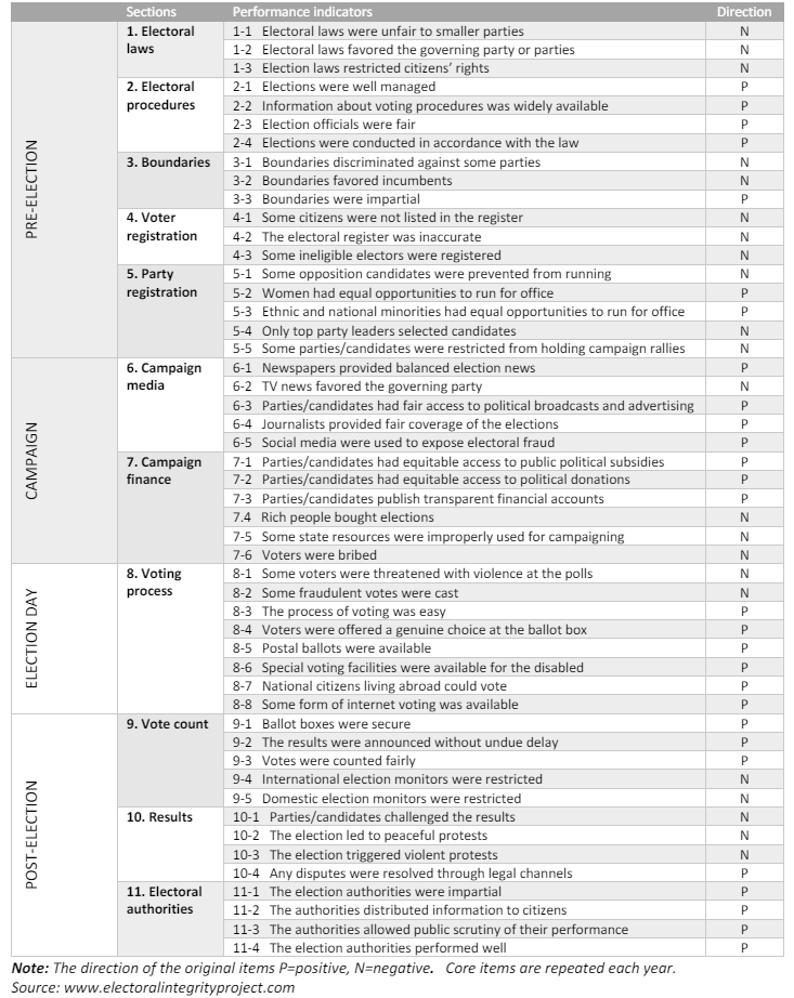 There are different approaches to measuring electoral integrity in the literature once the phenomenon has been conceptualised. Various data sources are used to measure electoral integrity, including election observation reports, news media, historical sources, public and country expert surveys, ethnographic studies and other sources541eb973c508 (van Ham 2015: 723; Birch 2011;; Garnett and James 2020). The PEI index is a leading cross-country dataset based on expert surveys. There are eleven sub-dimensions for which experts provide their assessment, including: electoral laws; electoral procedures; district boundaries; voter registration; party registration; media coverage; campaign finance; voting process; vote count; results; and electoral authorities (Garnett et al. 2023). These sub-dimensions cover the pre-election, campaign, election day and post-election phases.