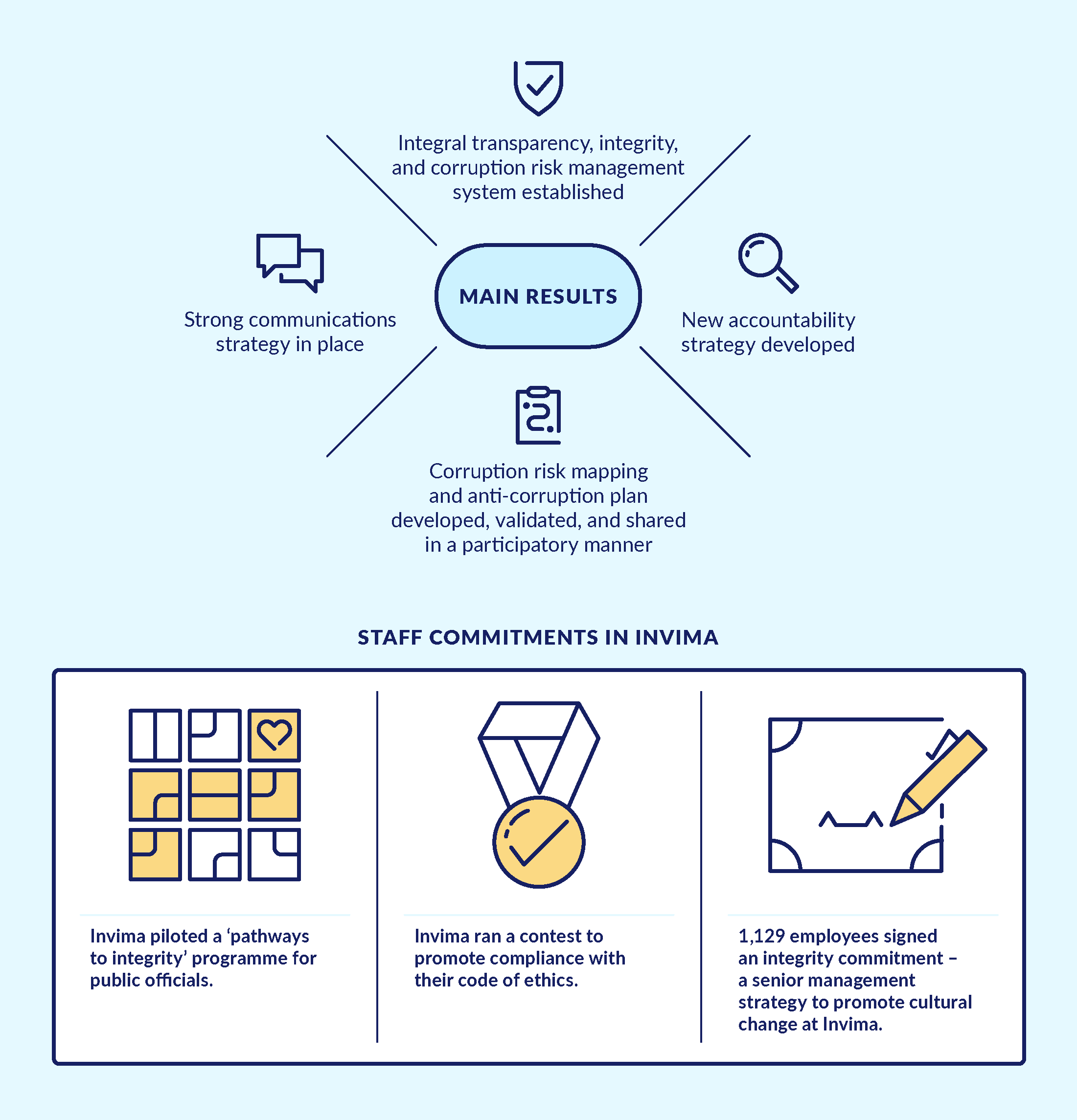 Thanks to the initial lessons learned, Invima’s senior leadership realised that the many formal compliance obligations regarding transparency and corruption prevention lacked coordination and a clear management purpose. Therefore, ACTUE Colombia provided technical assistance for a process at national and subnational levels to develop an ‘integrated transparency and integrity management system’. This system combined a set of preventive transparency and integrity measures with strategies for rapid response to allegations of corrupt practices, corruption network schemes, and ethical misconduct. Preventive measures included the implementation of a pilot project called ‘pathways for a culture of integrity, transparency, and the public good’.beba790ef3db A key operational aspect of this integrated system was the development of a strong internal and external communication strategy to encouraged the desired cultural change and promote preparedness to anticipate or react to alleged corruption.